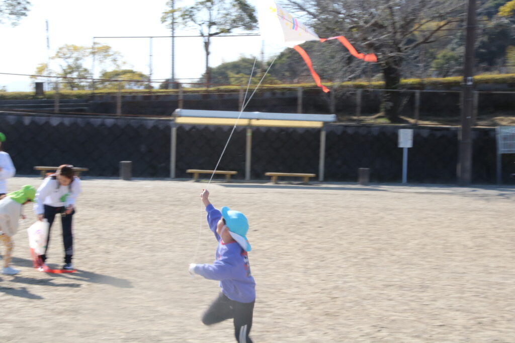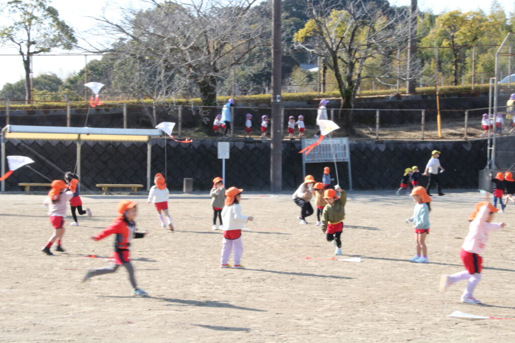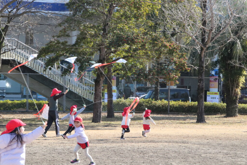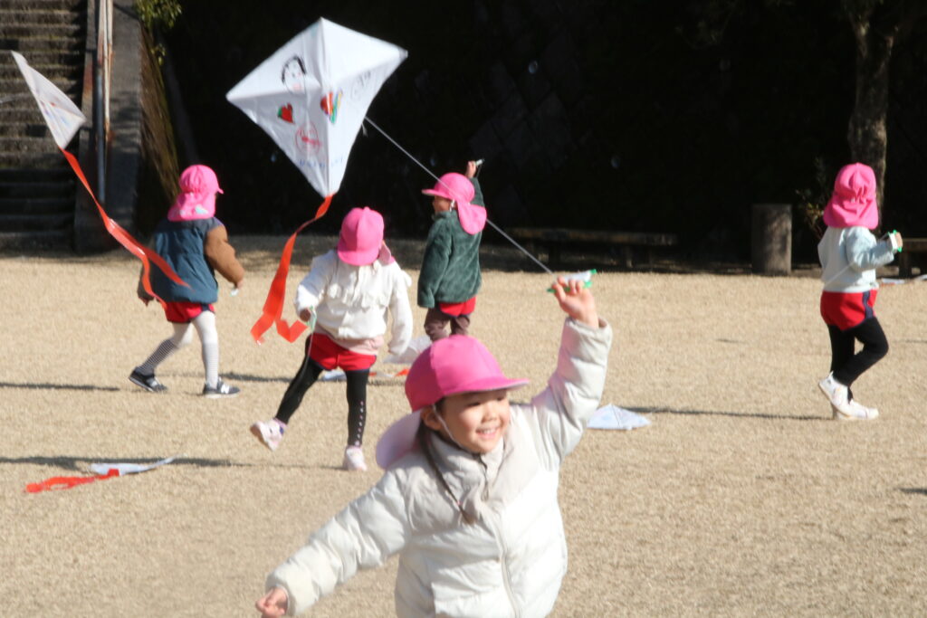 後半、年長クラスが自ら好きな絵を描きこんだ凧を気持ちよく揚げました。