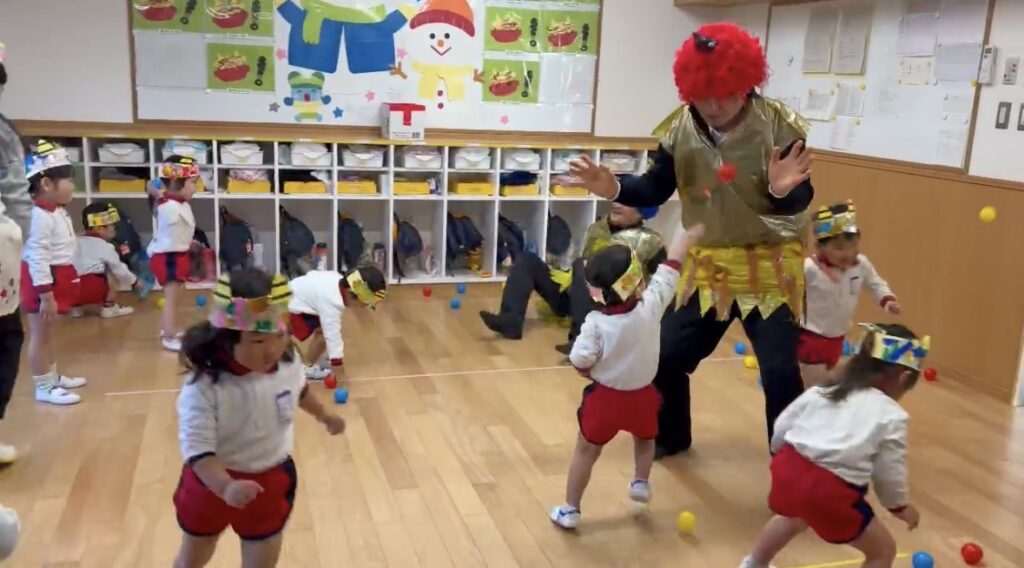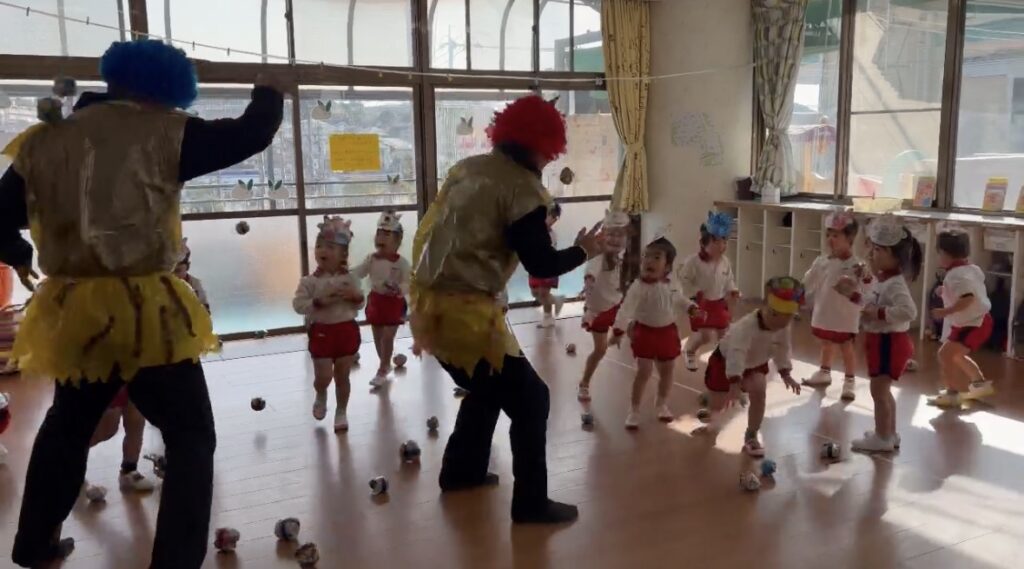 その後、赤鬼と青鬼は、園庭で行われた幼児部の年少→年中→年長の豆まきにも登場し、大豆をたくさん当てられて、保育部と同様にすごすごと退散していきました。