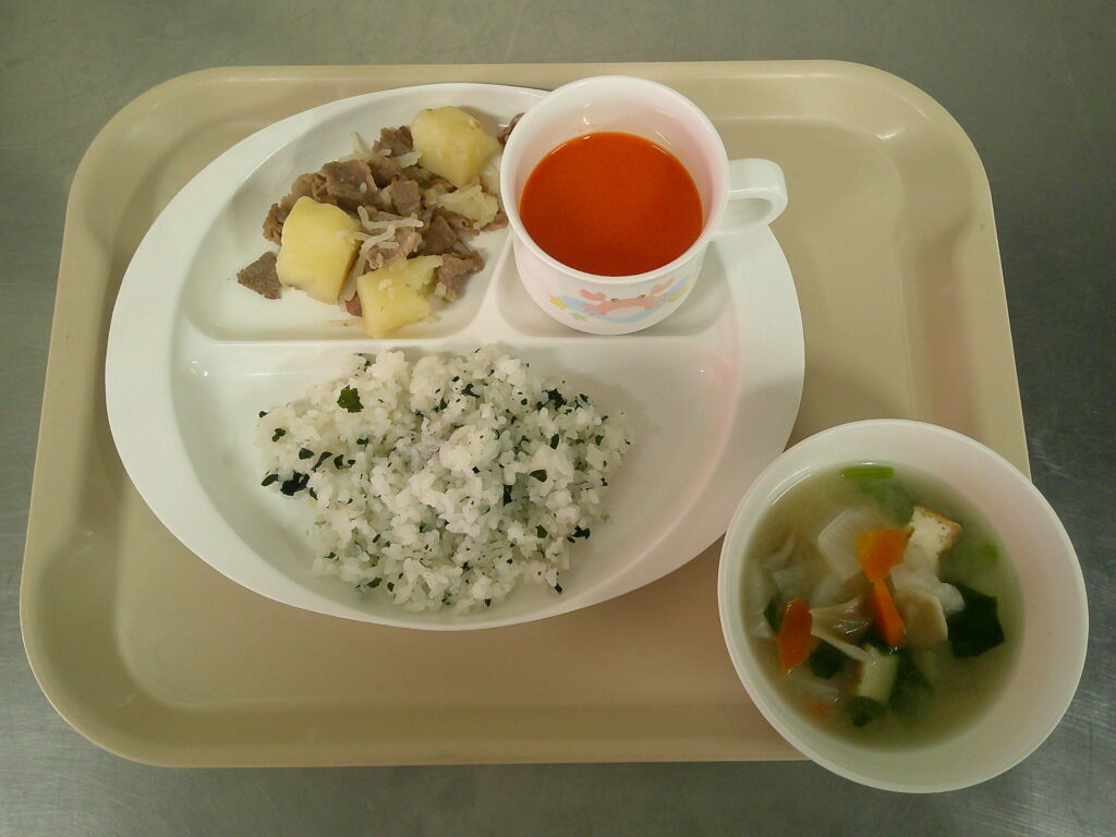ごはん、ごま塩、みそ汁、肉じゃが、野菜ジュース