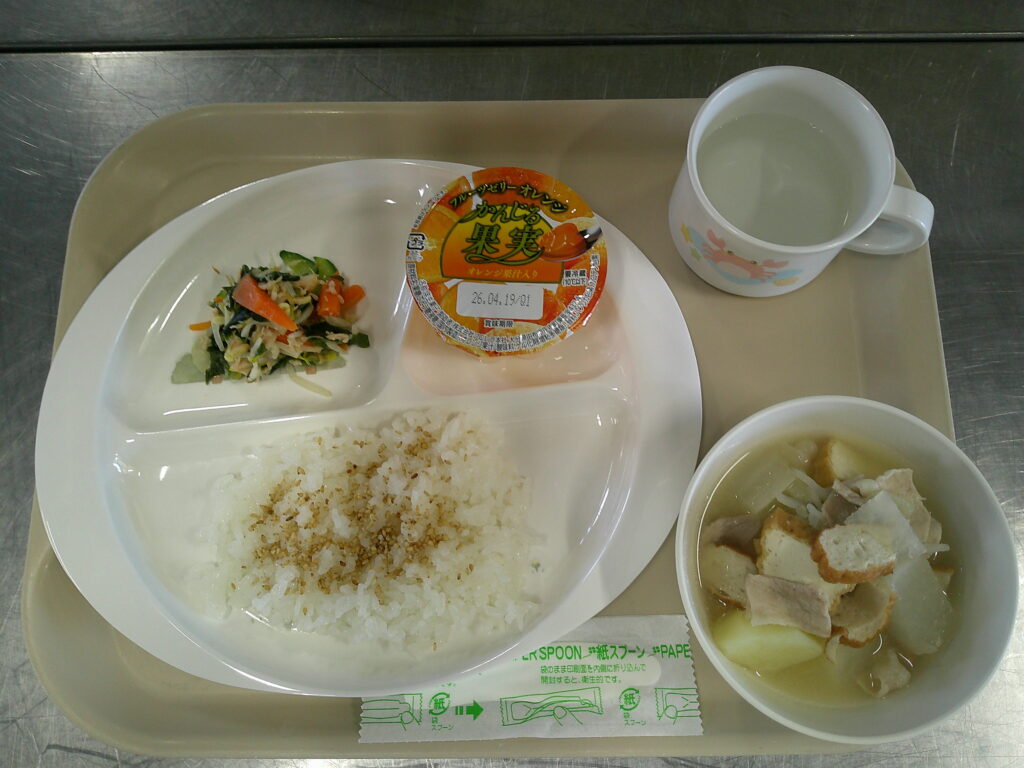 ご飯、みそおでん、シャキシャキサラダ、オレンジゼリー