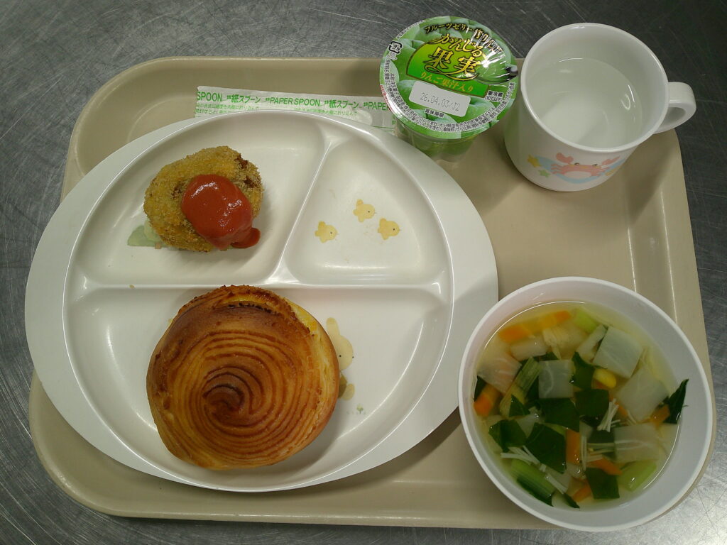 パン、具だくさんスープ、コロッケ、りんごゼリー