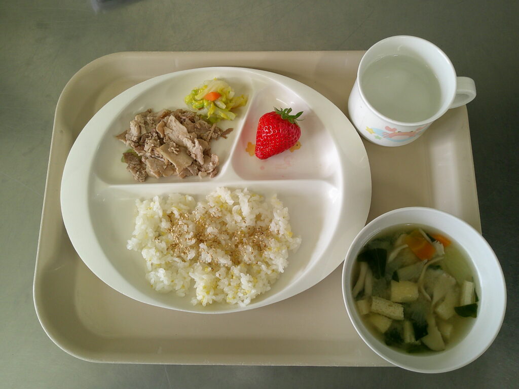 元気ごはん、ごま塩、みそ汁、豚の生姜焼き、レモンドレッシングサラダ、いちご -