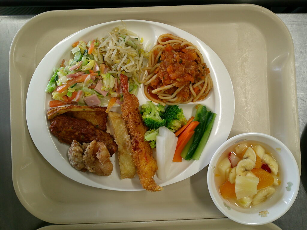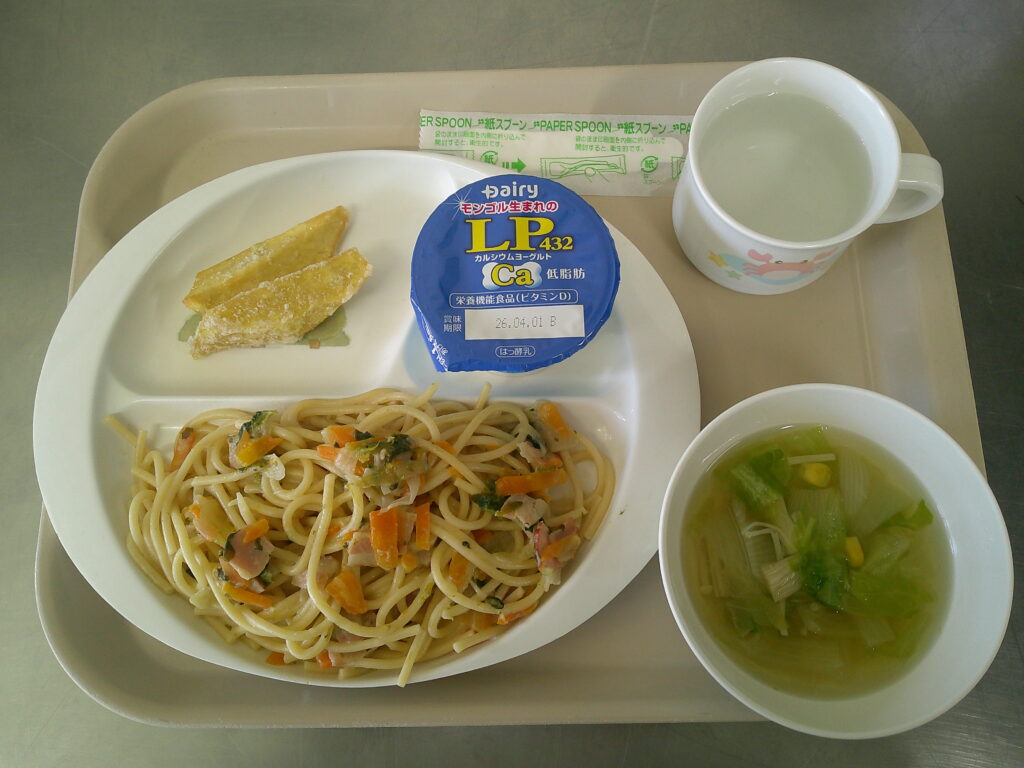 春野菜のクリームスパゲティー、レタススープ、芋かりんとう、ヨーグルト -