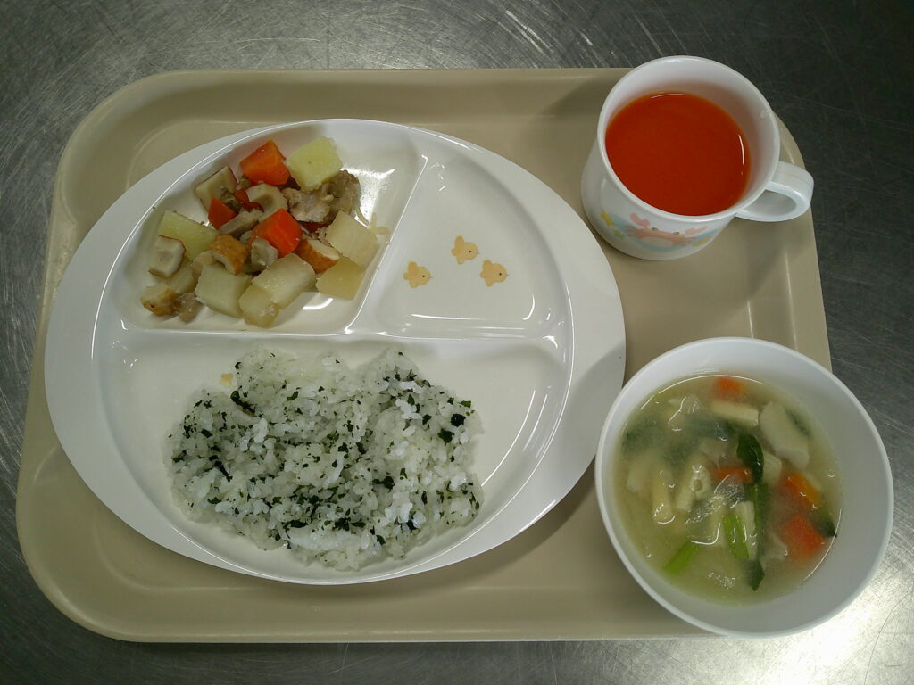 ごはん、ごま塩、みそ汁、肉じゃが、野菜ジュース -